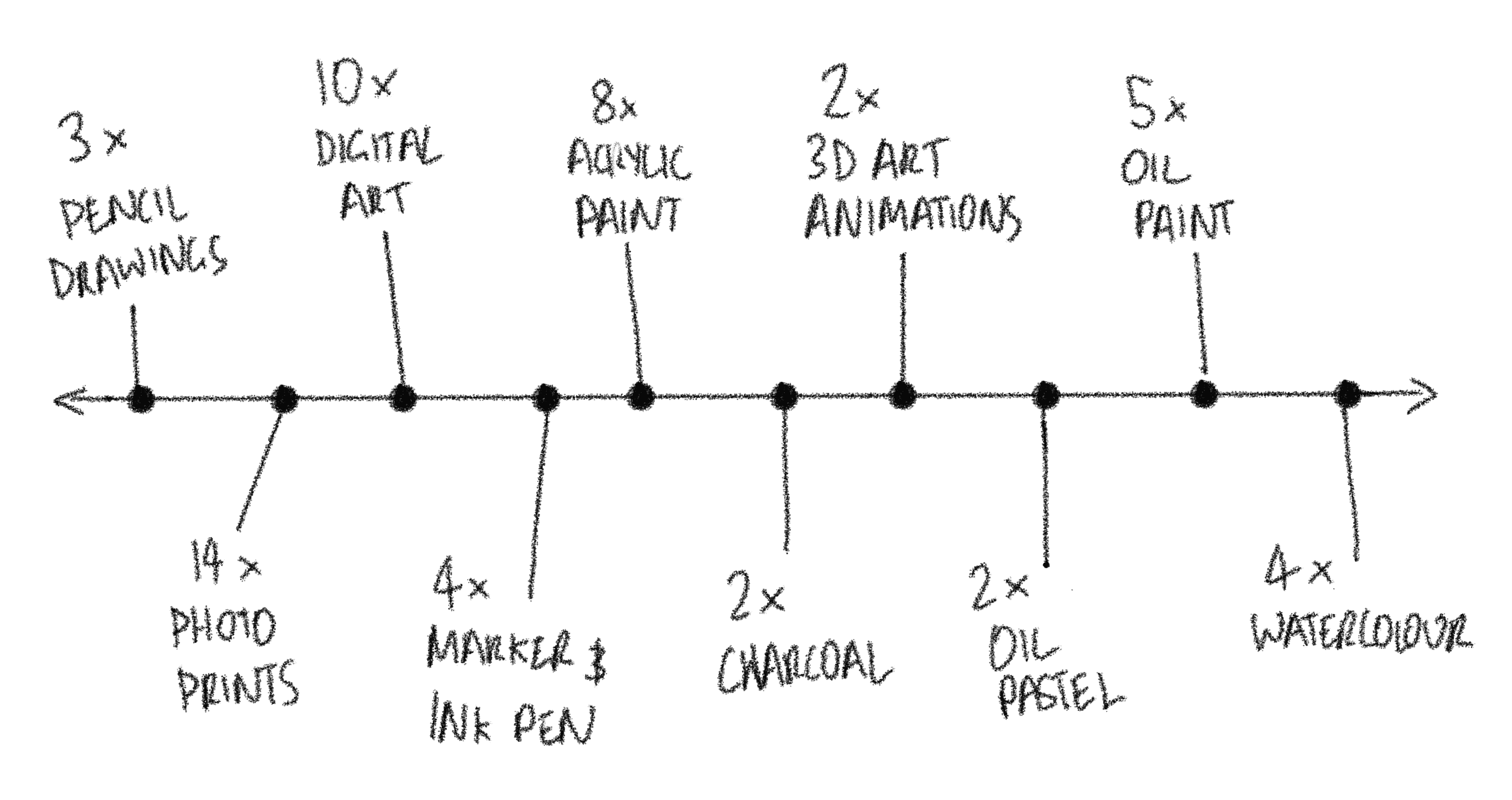 Intermittent pursuits started at a young age. After idolising Leonardo Da Vinci (classic polymath) and trying to replicate many of his artworks, I developed a somewhat loose dream of being an artist, and this never really left. In recent years I picked this up again, but danced between artistic interests. Every new project followed the same pattern: