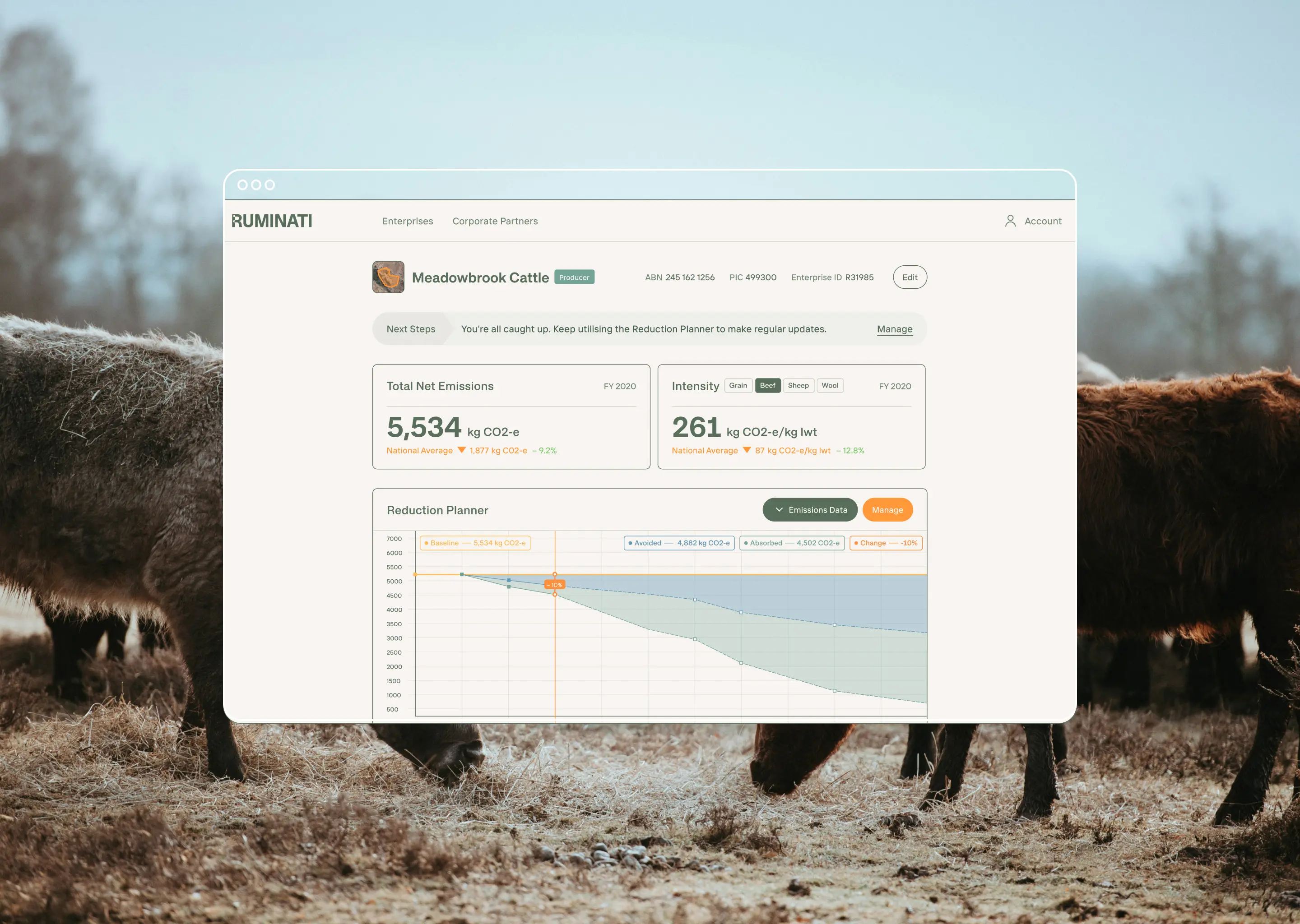 Ruminati is a new climate solution tool built by farmers, for farmers. It gives producers the power to quickly calculate their emissions data on a single platform, and share it with organisations across the supply chain. Working closely with founders and cattle farmers Will Onus and Bobby Miller, we’re spearheading a sustainable agricultural movement to propel Australia towards Net Zero.